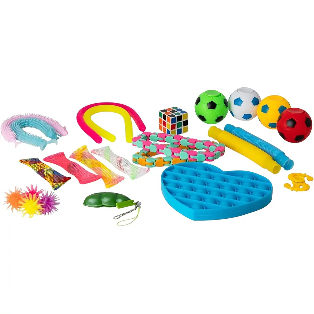 Набір Tobar Фіджет Сет принесе вам не тільки задоволення, але й користь. В цей набір входить 24 предмети, завдяки чому вашій дитині не набридне гратися з ним. М'який та еластичний матеріал іграшок з набору приємно піддається тиску, допомагаючи зняти стрес та відчути полегшення.