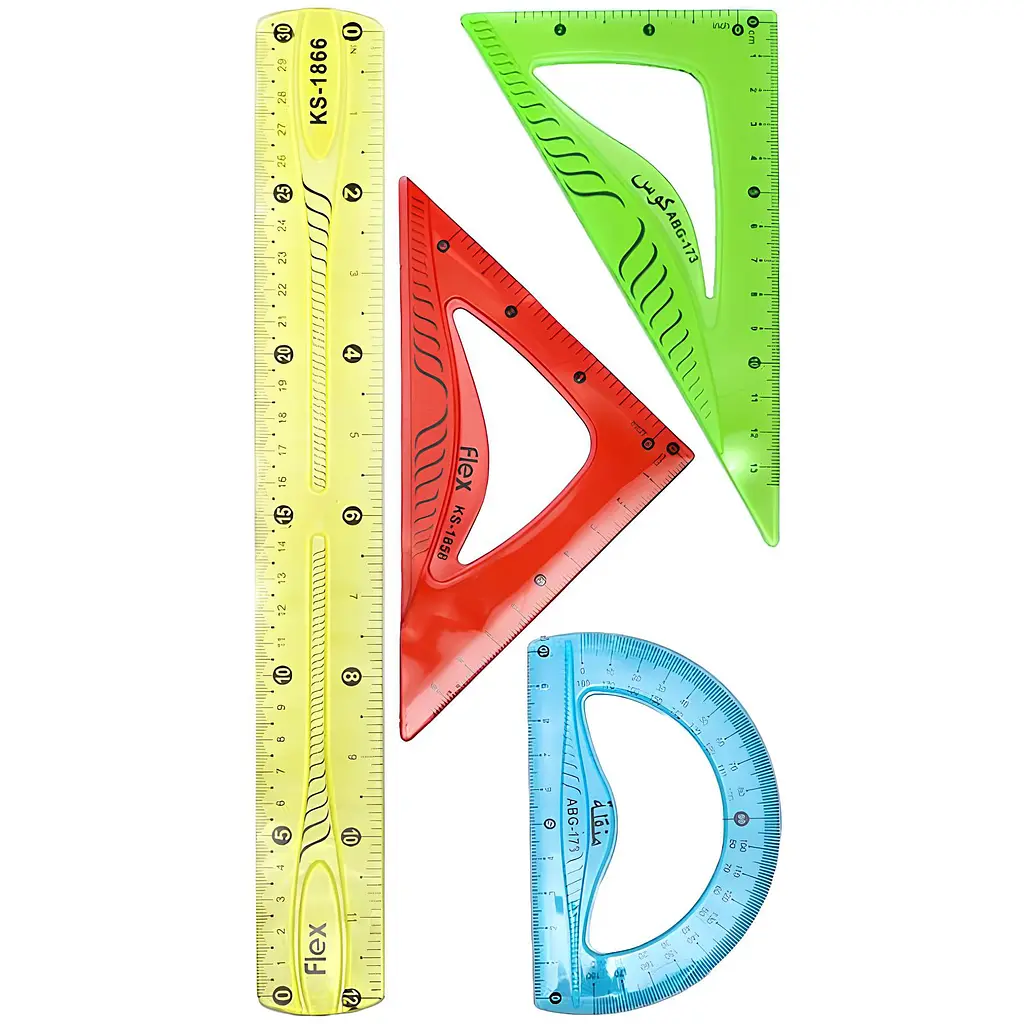 У наборі: лінійка 30 см, трикутник (2 шт.), транспортир.