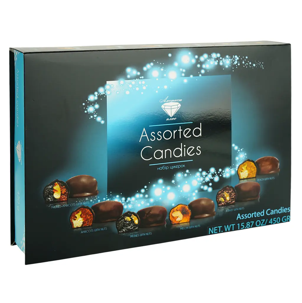 Цукерки Аметист Плюс Асорті - це чорнослив із горіхом, чорнослив + курага з горіхом, курага з горіхом, диня з горіхом, фінік із горіхом, персик із горіхом.