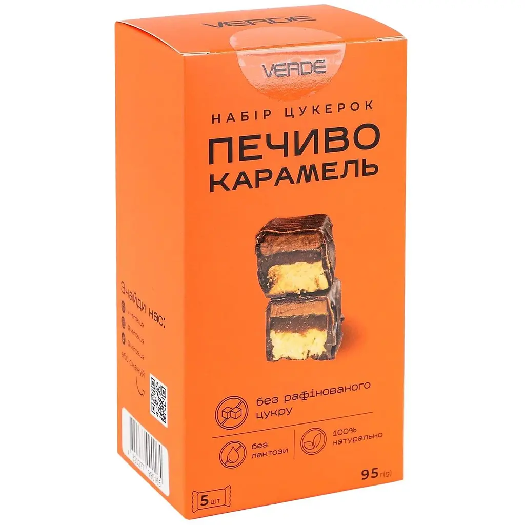 Набір цукерок Verde Печиво-карамель з хрустким фундучним печивом та тягучою кокосовою карамеллю – це справжній витвір кулінарного мистецтва для тих, хто цінує здоровий спосіб життя і неперевершений смак.