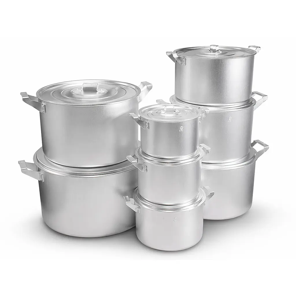 Набір алюмінієвих каструль Interos включає вісім каструль різного об'єму: 2.5, 3.5, 4.5, 6, 8, 10, 15 і 20 літрів.