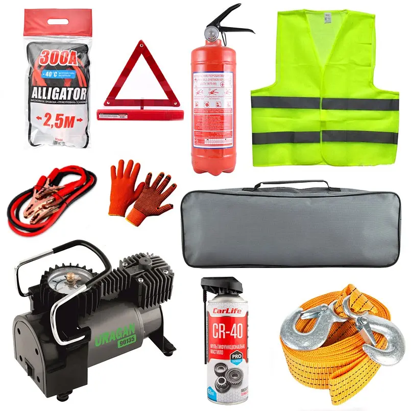 Компресор автомобільний Uragan з автостопом 90135 Провода-прикурювачі Alligator 300А, 2м BC631 Буксирувальний трос Carlife 4,5т, 5м TR705 Знак аварійної зупинки WT101 Вогнегасник порошковий ВП2 VP2-X Жилет сигнальний XL BX18110 Змазка багатофункціональна CarLife CR-40 Multifunctional Lubricant Professional, 450мл CF453 Розмір (ШхВхГ): 58 х 18 х 13 см Рукавиці покриті нітлилом WG08 Cумка органайзер велика