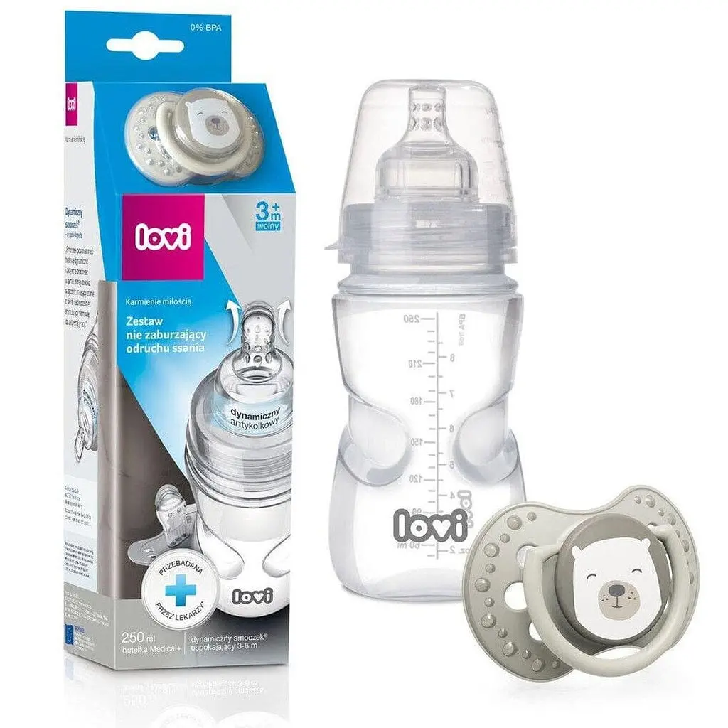 Набор "Защита рефлекса сосания" содержит бутылочка Medical +; кружечка / крышечка; динамическая соска; уплотнительный диск; накрутка; динамическая пустышка. LOVI Динамическая соска 3м + свободный поток. Широкая, твердая, профилированная основа изготовлена из более толстого слоя силикона. Обеспечивает стабильную опору для губ, предотвращает кусание основы соски. Система SUPERvent - новый вентиляционный клапан предотвращает всасывание соски, снижает риск появления колик. LOVI Динамическая пустышка с уникальным универсальным узором 3-6м. Облегчает дыхание и глотание слюны благодаря профилированной основе. Отверстия в основе обеспечивают свободную циркуляцию воздуха и предотвращают раздражение нежной кожи ребенка.
