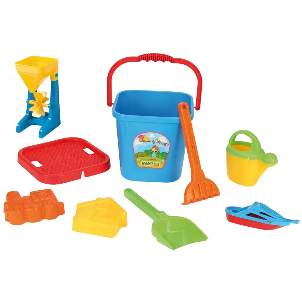 Лопатка, граблі, відро, млин, лійка, 2 цікаві формочки, кораблик і сито дадуть безмежний простір фантазії малюка в побудові пісочних замків. Ігри з піском принесуть величезну користь для розвитку його творчих здібностей, координації та моторики ручок.