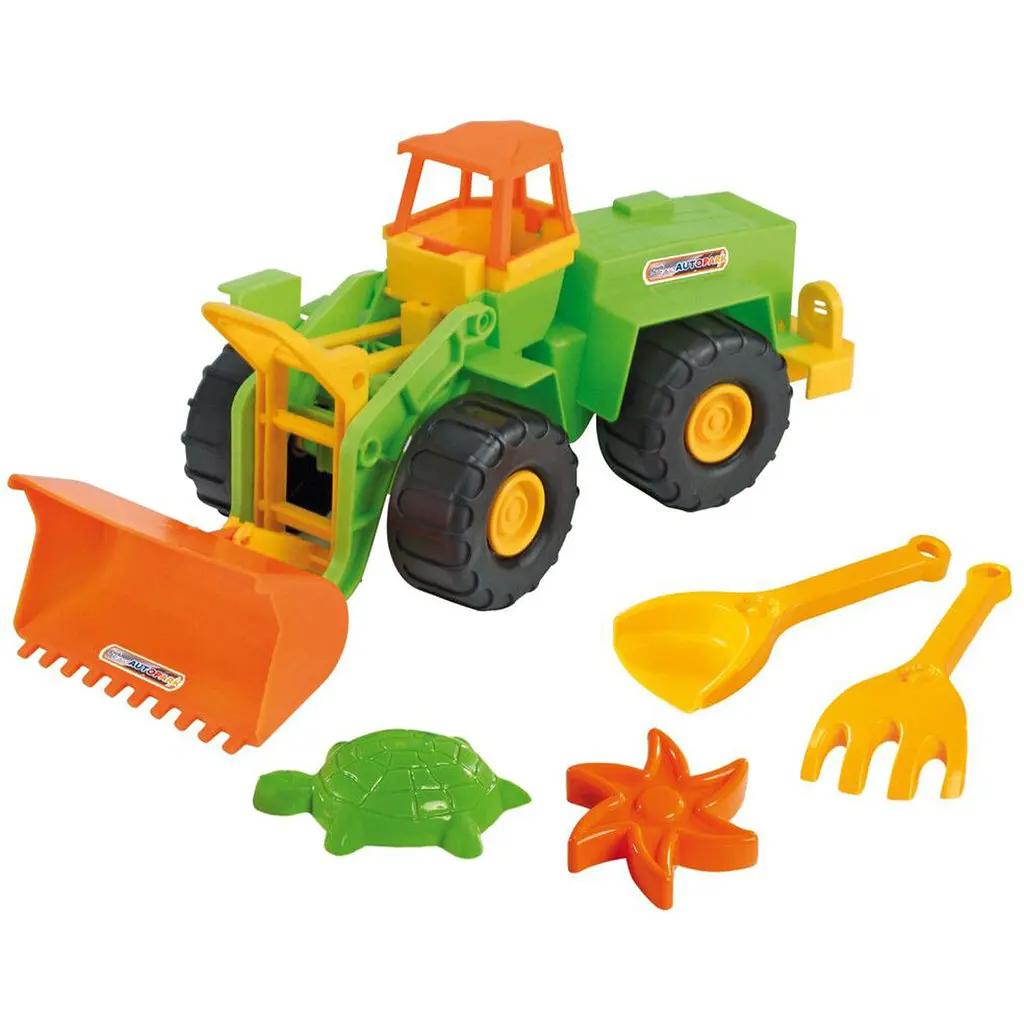 Екскаватор довжиною в 36 см має рухливий ківш і кузов, завдяки яким гра стає ще більш реалістичною і захоплюючою. У набір також входить зручна лопатка, граблі та 2 формочки, які створюють необмежені можливості для побудови пісочних конструкцій.