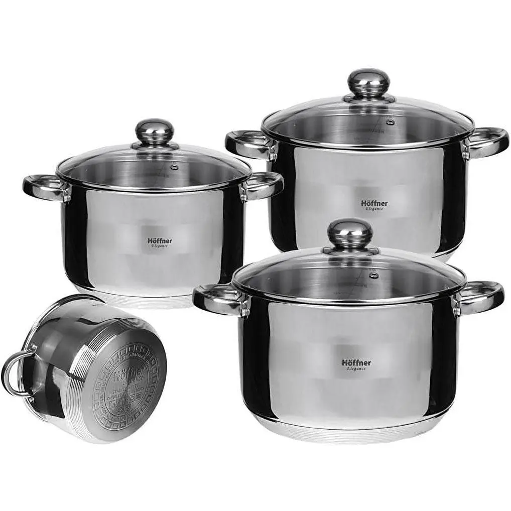 Набір з 6 предметів 3 каструлі з кришками. Каструлі з високоякісної нержавіючої сталі із сатинованим покриттям. Завдяки дев'яти шарам дна каструлі швидко та рівномірно розподіляють тепло. Каструлі підходять для приготування всіх видів плит: індукційних, газових, керамічних, скляних, галогенних і електричних.