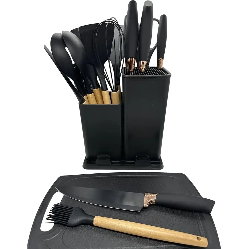 Переваги: Завдяки 19 предметам, що входять у набір, ви зможете спробувати себе у різних кулінарних приготуваннях. Заточені ножі забезпечують відмінну ріжучу здатність, а високоякісні матеріали гарантують довговічність та надійність.