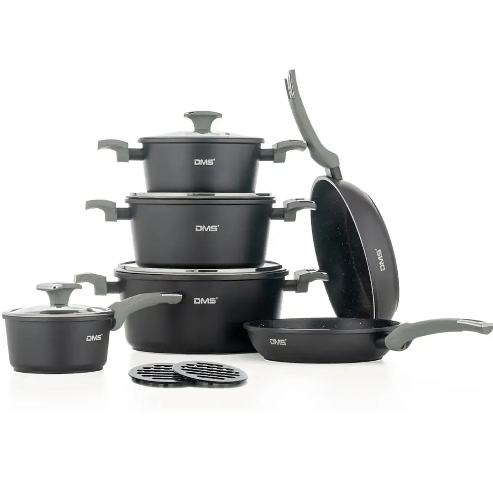 З нашим набором каструль із 10 предметів ви отримуєте дві сковороди різного розміру з мармуровим покриттям і три каструлі різного розміру з кришками, а також каструлю з кришкою.