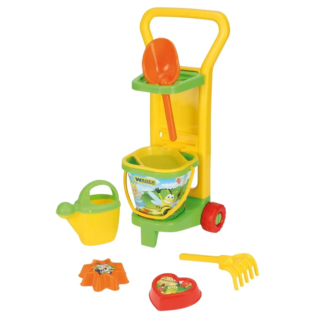 Яскравий і барвистий набір включає в себе візок, відерце і набір інструментів садівника. Він представлений в соковитих кольорах, які асоціюються з сонечком і зеленню, а також прикрашений зображеннями казкових персонажів на тлі зеленої травички.