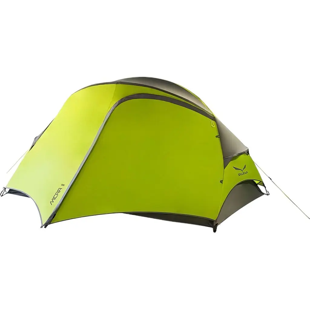 Намет Salewa Micra 2 - двомісний трисезонний легкий намет з одним входом та одним тамбуром. Дуги, що двічі перехрещуються, збільшують внутрішній простір у висоту. Великий захищений від дощу вхід на двоходовій блискавці, що відкривається зсередини, може служити додатковим вентиляційним отвором. Два вентиляційних отвори з боків забезпечують хороший потік повітря і ефективно знижують утворення конденсату всередині намету. Спеціальна срібляста верхня частина тенту відбиває сонячні промені. Намет достатньо великий для двох людей з невеликою кількістю спорядження або дуже комфортний одномісний намет для тривалих пригод.