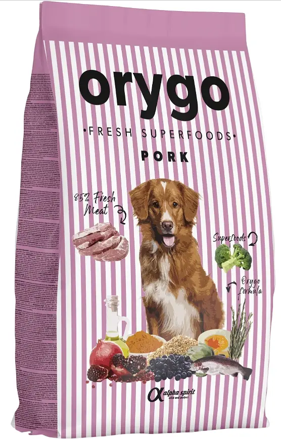 ORYGO Pork – повнораціонний напіввологий корм зі свининою та броколі для дорослих собак всіх порід. Натуральна збалансована та здорова рецептура Оріго готується делікатно, за допомогою холодного віджиму за низьких температур зі 100% свіжих інгредієнтів. Кожен інгредієнт у складі відбирається з особливою турботою, де основним пріоритетом вибору є здоров’я та відмінне самопочуття вашого собаки.