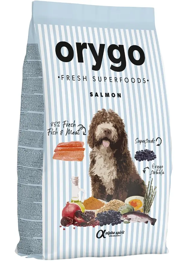 ORYGO Salmon – повнораціонний напіввологий корм з лососем та чорницею для дорослих собак. Натуральна збалансована та здорова рецептура Оріго готується делікатно, за допомогою холодного віджиму за низьких температур зі 100% свіжих інгредієнтів. Кожен інгредієнт у складі відбирається з особливою турботою, де основним пріоритетом вибору є здоров’я та відмінне самопочуття вашого собаки.