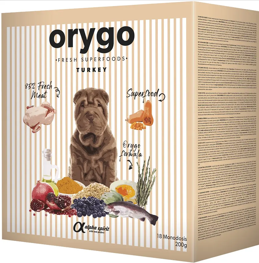 ORYGO Turkey повнораціонний напіввологий корм з індичкою та гарбузом для дорослих собак всіх порід. Натуральна збалансована та здорова рецептура Оріго готується делікатно, за допомогою холодного віджиму за низьких температур зі 100% свіжих інгредієнтів. Кожен інгредієнт у складі відбирається з особливою турботою, де основним пріоритетом вибору є здоров’я та відмінне самопочуття вашого собаки.
