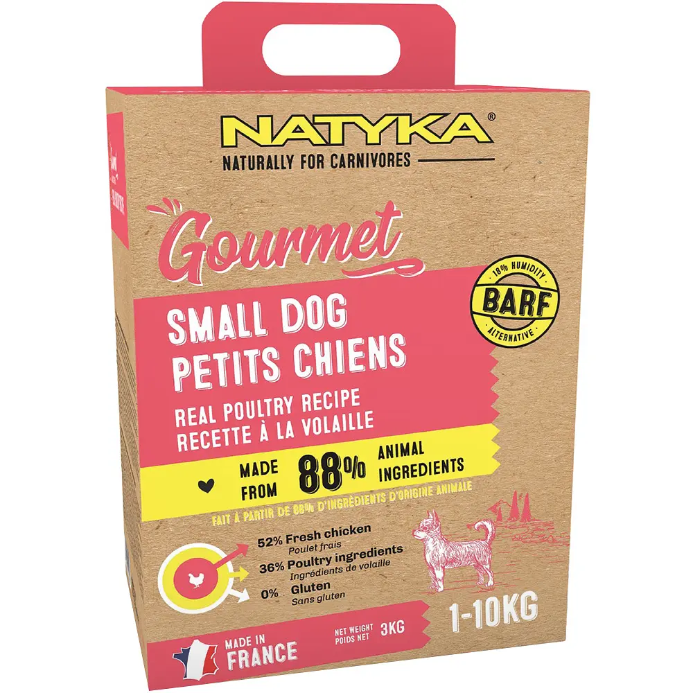 NATYKA Gourmet Small Dog Poultry - напіввологі гранули, що не містить глютену та ідеально підходять для дорослих собак малих порід. Рецепт містить 88 % інгредієнтів тваринного походження.