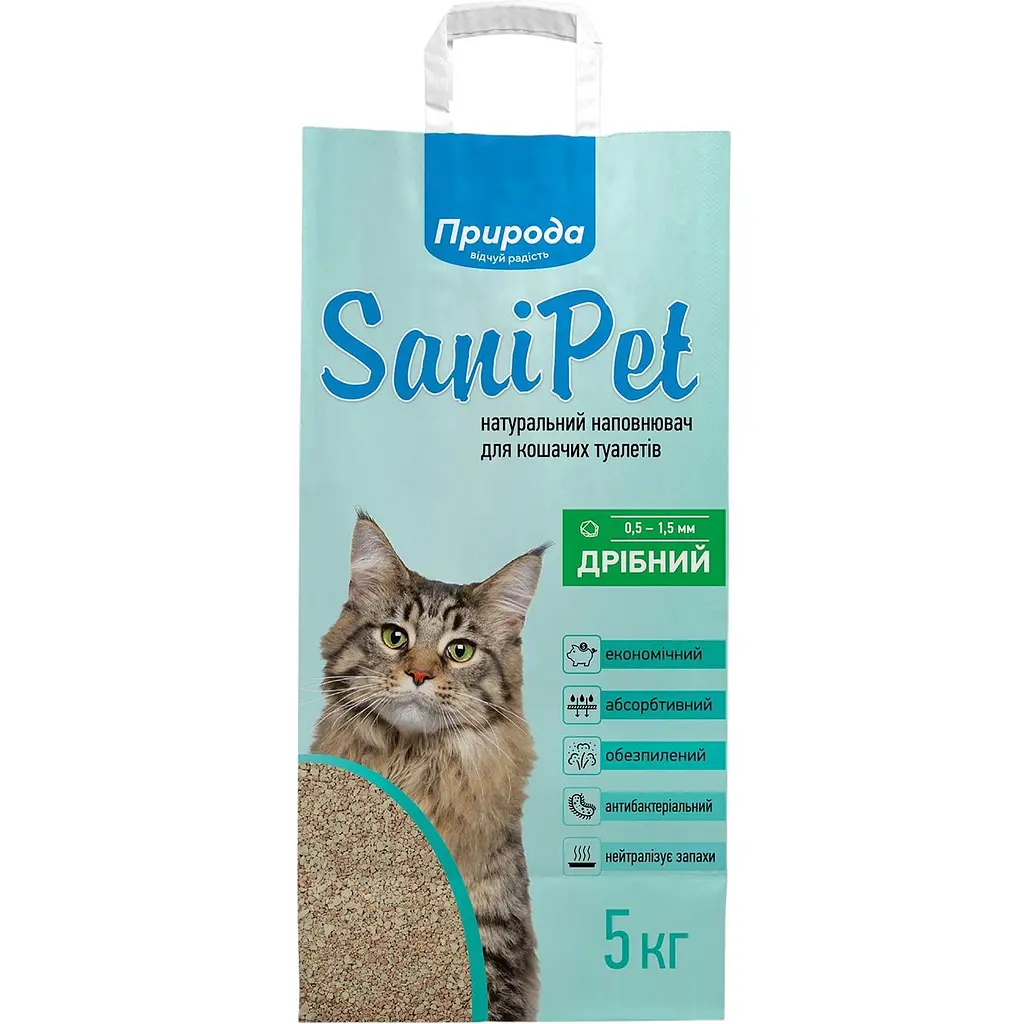 Наповнювач бентонітовий Природа Sani Pet дрібний - натуральний наповнювач для лотків, що має високі абсорбувальні властивості. Він створений з бентонітових і палигорськітових глин, які пройшли очищення і спеціальну обробку.