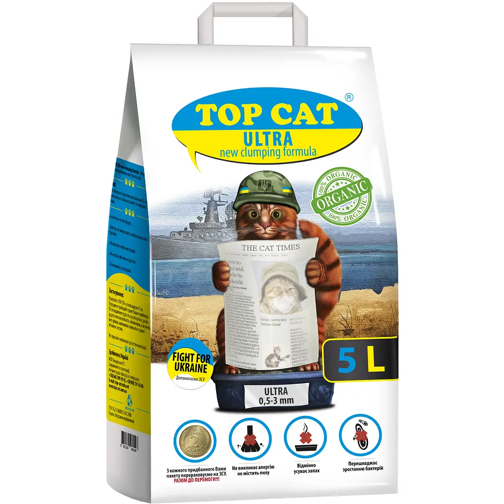 Наповнювач Top Cat Ultra підходить для всіх порід кішок та кошенят, виготовлений з бентоніту. Він має велику фракцію (0.5-3 мм), що забезпечує хорошу поглинання вологи та запахів.