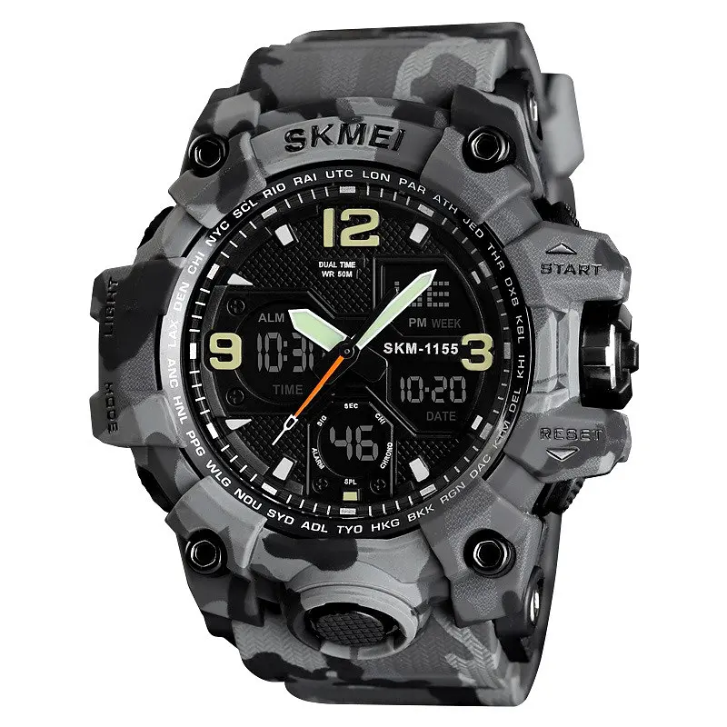 Наручний годинник SKMEI 1155 - це спортивна модель, стильний дизайн якої оцінять чоловіки віддають перевагу брутальні аксесуари і дотримуються цього стилю в одязі. Якісні протиударні матеріали захистять механізм пристрою від пошкоджень, водонепроникність дозволить не знімати годин навіть коли Ви приймаєте душ або плаваєте в басейні. Управління всіма функціями здійснюється натисканням декількох кнопок, ви без праці запустити таймер або секундомір навіть під час бігу по біговій доріжці.
