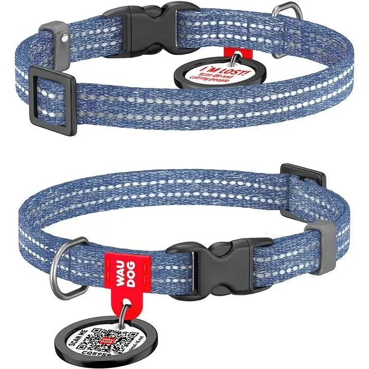 Нашийник для котів та дрібних порід собак Waudog Re-cotton з QR паспортом, відновлена бавовна, світловідбиваючий, пластикова пряжка, XS, Ш 10 мм, синій