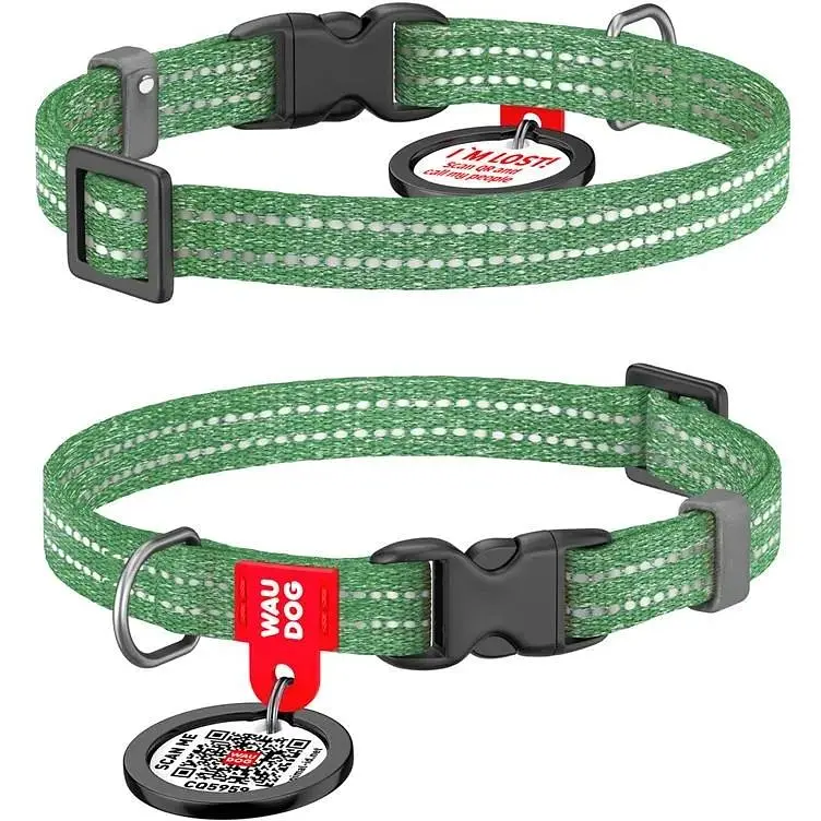 Нашийник для котів та дрібних порід собак Waudog Re-cotton з QR паспортом, відновлена бавовна, світловідбиваючий, пластикова пряжка, XS, Ш 10 мм, зелений