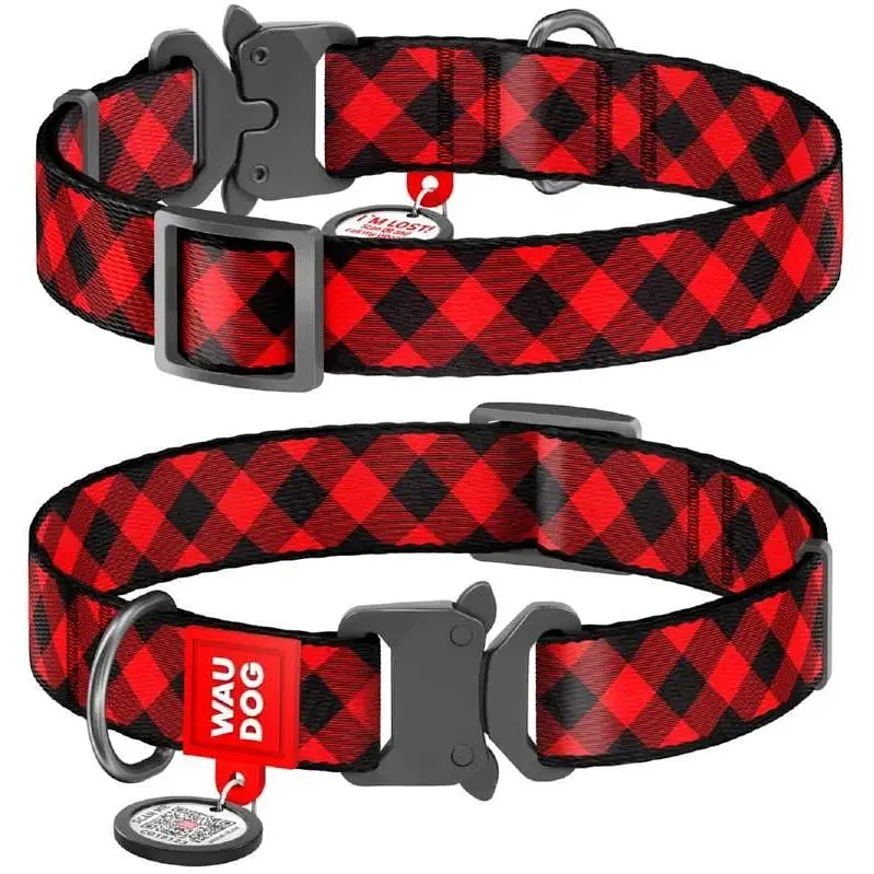 • Нашийник для собак Waudog Nylon нейлоновий c QR паспортом, малюнок Шотландка червона, металева пряжка-фастекс, M, Ш 20 мм, Дов 24-40 см - мініатюра 1
