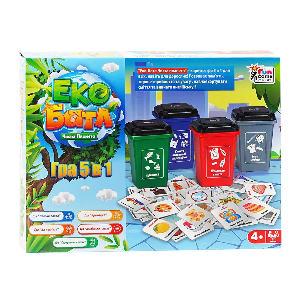 Привіт, наша маленька ековарта! Чи знаєте ви, що сміття слід сортувати і як саме правильно це робити? “Еко батл” - це навчальна гра, яка допомагає дітям вивчати та розуміти важливість правильного сортування сміття. Ігровий набір складається з 4-х кольорових смітників, кожен з яких відповідає певному виду сміття: пластик, папір, скло та органічні відходи. Кожен смітник має яскравий колір і відповідне маркування, що допомагає дитині легко визначити, куди потрібно викидати певний вид сміття. Набір містить картки із зображеннями предметів, які потрібно відсортувати. Завдання дитини - роздивитися ці предмети та розмістити їх у відповідні смітники. Наприклад, пластикова пляшка піде у смітник для пластику, стара газета - у смітник для паперу, залишки харчових продуктів - у смітник для органічних відходів, а скляна пляшка - у смітник для скла. Однак набір пропонує цілих 5 варіантів гри, щоразу підкидаючи дитині нові цікаві завдання. Ігровий набір не тільки розвиває уяву та моторику дитини, навчає її важливим екологічним принципам, дає зрозуміти, що сортування сміття сприяє поліпшенню якості води та зниженню загального рівня забруднення. Він сприяє формуванню у дітей свідомого ставлення до довкілля, відповідальності за власні дії та підтримує екологічно освічений спосіб життя. Особливості: - вікова категорія - 4+; - кількість гравців:1-4; - 5 варіантів гри: 1 - “Поясни слово” 2 - “Крокодил” 3 - “Гра на пам’ять” 4 - “Англійська - легко” 5 - “Сортування сміття”. Комплектація: - 4 смітники різних кольорів; - 100 ігрових карток; - інструкція. * Характеристики та комплектація товару можуть змінюватися виробником без повідомлення