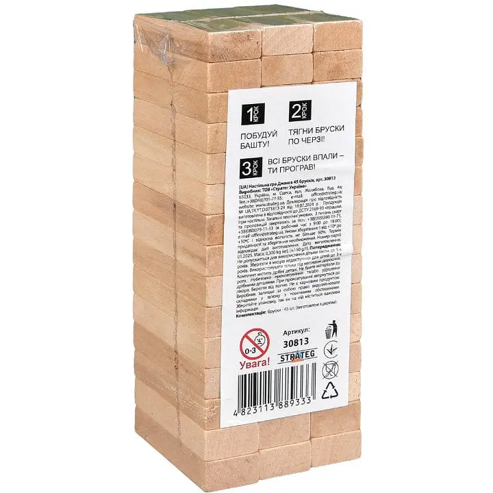 "Джанга 45 брусків" - класична гра на спритність і витримку. Гравці по черзі витягують бруски з вежі та ставлять їх угору, намагаючись не зруйнувати конструкцію.
