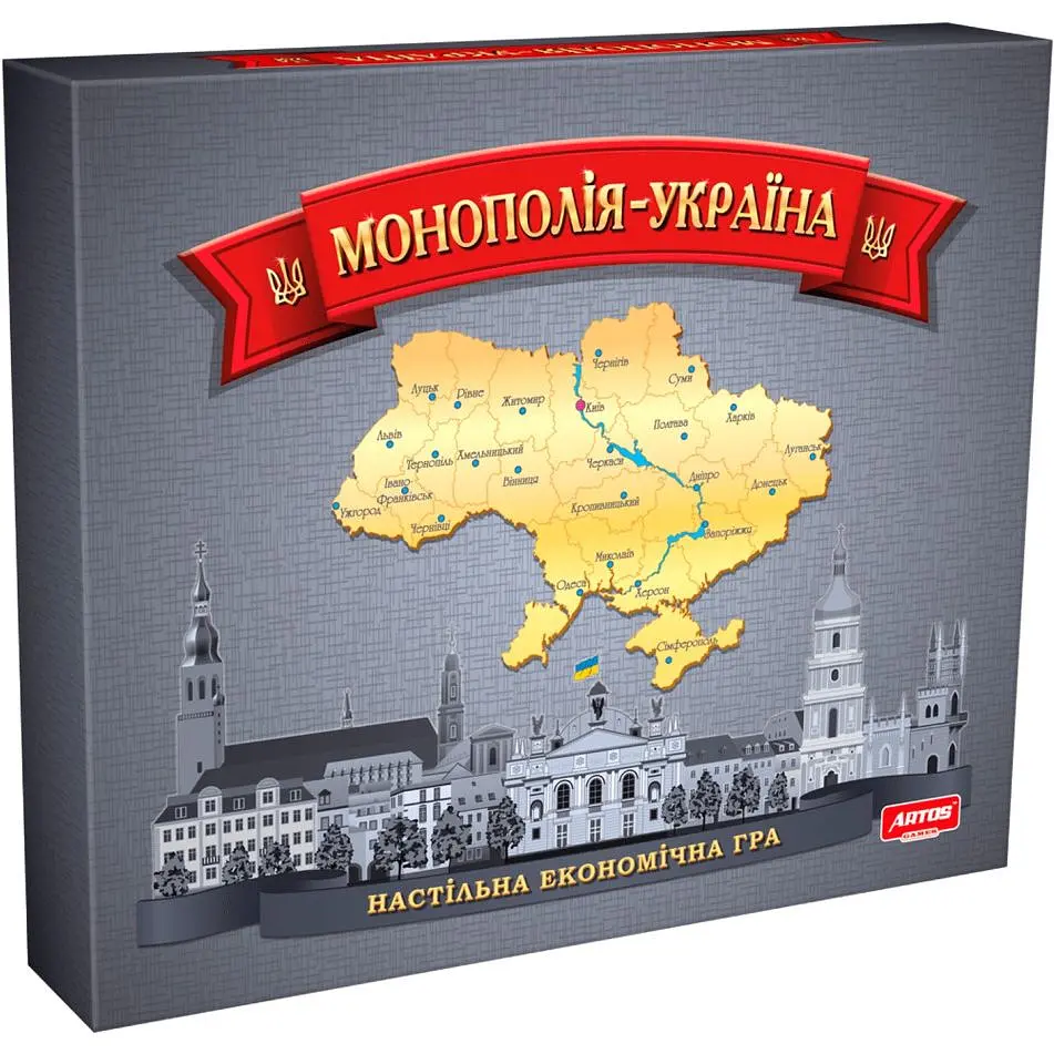 Дитяча настільна гра "Монополія Україна" 0734ATS - універсальна забава для дітей і дорослих, яка допоможе скрасити сумний вечір, стане улюбленою розвагою для Вашої родини. Учаснику гри надається можливість стати монополістом у сфері нерухомості. В процесі гри, переміщаючись по ігровому полю, кожен гравець буде купувати нерухомість, брати участь в аукціоні на її придбання, а також будувати будинки і готелі. Учасники зможуть приймати орендну плату з інших гравців, які зупиняються на їх ділянках. Під час ігрового процесу гравцям доведеться платити податки, штрафи, адміністративні стягнення, і навіть надаватися в тюрмі або звільнятися з неї за певну плату. Той учасник монополії, який не стане банкрутом, і оголошується переможцем.