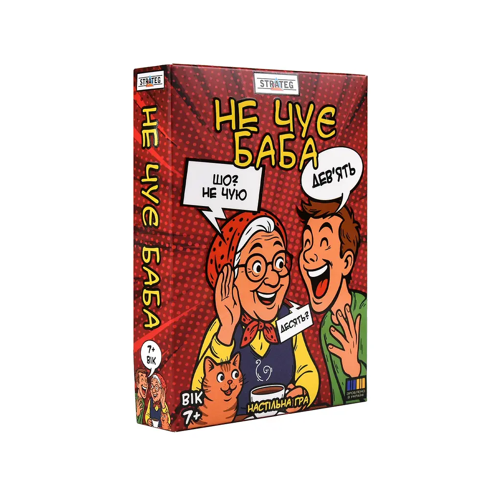 «Не чує баба» — весела настільна гра на відгадування слів по губах. У ній гравці намагаються зрозуміти слова без жодного звуку. Це чудовий спосіб перевірити, наскільки добре ви розумієте одне одного без слів. Гра чудово підходить для компанії друзів, підлітків, сімейного дозвілля й усіх, хто любить змагання. Доведи, що навіть нечуючу бабу не проведеш! Вік: 7+ Кількість гравців: 2-10 Розмір коробки: 14х10х2,5 см Вага: 160 г
