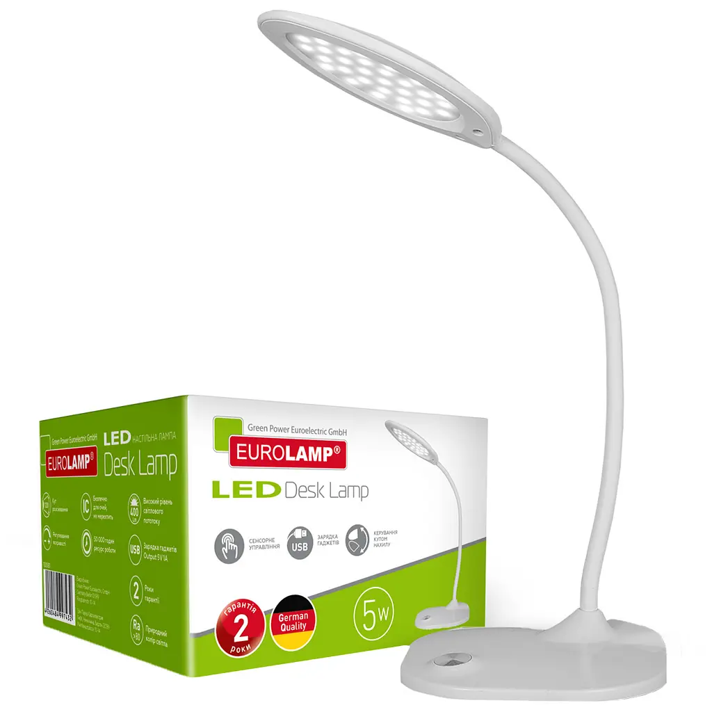 Настільна лампа Eurolamp LED у стилі Hi-Tech, 5W, 5300-5700K дуже компактна: вона невеликого розміру і при непотрібності її можна скласти та вона стане ще вдвічі меншою. Лампа має скляну підставку, що робить її універсальною під сучасні інтер'єри. Ви можете керувати нахилом світильника для зручного свічення світла. І керувати яскравістю за допомогою сенсорної кнопки.