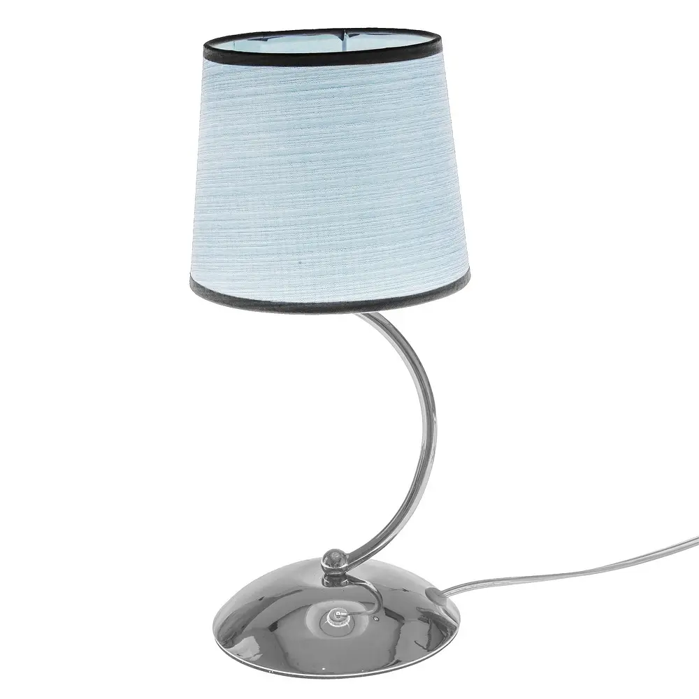Конструкція представлена металевою круглою основою кольору хром, фігурної ніжкою і тканинним абажуром світло-блакитного кольору.