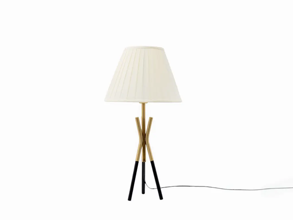 Тринога конструкція пірамідальної форми із бронзовими елементами та тканинним плісерованим конічним абажуром.