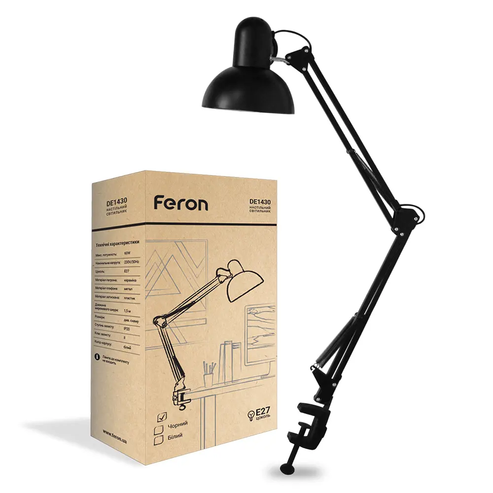 Настільний світильник Feron DE1430 в сучасному стильному дизайні з металевим корпусом ідеально підійде для сучасного інтер'єру офісу або робочого простору і стане його прикрасою. Модель передбачає кріплення на струбцину або встановлення на спеціальну осно ву LD1431, яка не входить до комплекту. Завдяки цьому світильник можна або зафіксувати в будь-якому зручному положенні на столі чи полиці, або поставити на стіл. О сновні переваги Конструкція корпусу дозволяє регулювати висоту світильника і положення плафона та направляти світло в потрібну точку і не з асліплюючи очі. Світильник оснащен о керамічним патроном Е27 під лампу загального призначення, тому ви самі можете вибрати вид лампи для нього і таким чином керувати яскравістю і температурою свічення. Д одатково Модель представлена в двох кольорах: білий і чорний з мережевим шнуром 1,5 м в комплекті Технічні характеристики можуть змінюватися в залежності від партії Бренд: Feron Гарантія: 12 місяців Кількість джерел світла: 1 Колір: чорний Комплектація: без лампи Матеріал: метал Матеріал плафона: метал Напруга мережі: 220-240 Тип цоколя: Е27 Розмір: 335*335*155 мм Клас захисту (IP): IP20 Тип джерела світла: Під лампу Тип лампи: A60 Тип світильника: настільний