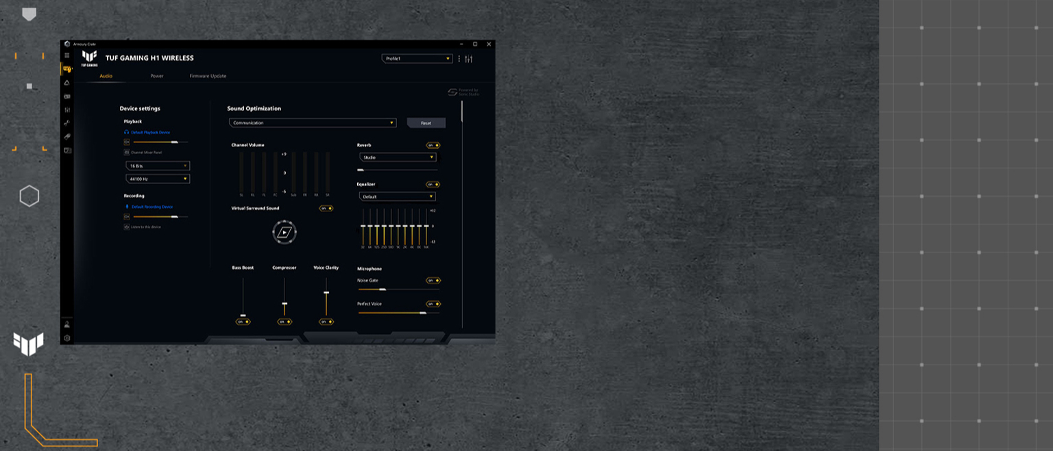 Armoury Crate є єдиним центром керування ігровими продуктами ASUS. У його інтуїтивно зрозумілому інтерфейсі представлені різні налаштування, пов'язані з комп'ютерною системою, тому користувач зможе гнучко налаштувати параметри гарнітури TUF Gaming H1 Wireless на свій смак.