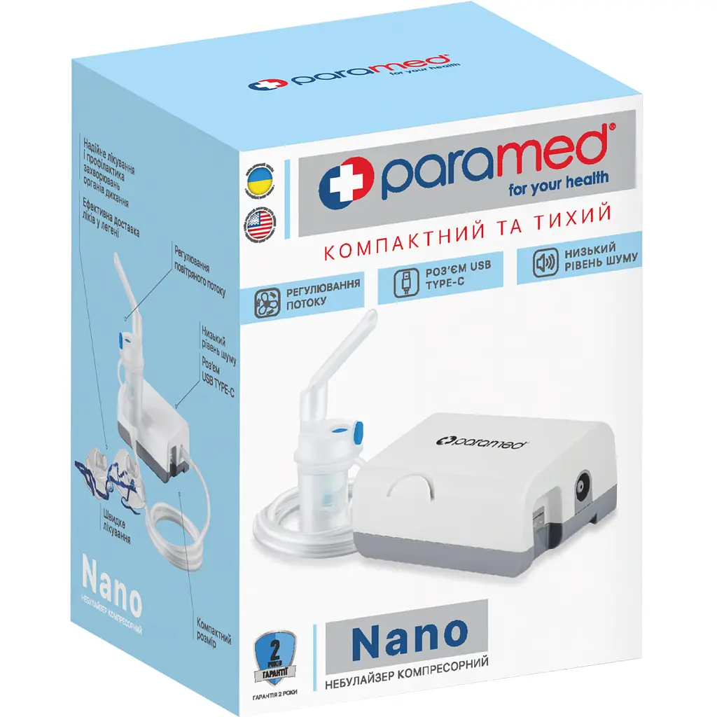 Компресорний небулайзер Paramed Nano – це унікальний пристрій дозиметричного типу, спеціально розроблений для зручного проведення інгаляцій у домашніх умовах. Завдяки вбудованому роз'єму USB Type-C, він може працювати від павербанку або ноутбука, що особливо корисно у разі відсутності електроенергії в мережі. Компактні розміри та зручна сумочка для зберігання дозволяють легко використовувати небулайзер не тільки вдома, але й у дорозі, забезпечуючи комфорт та мобільність.