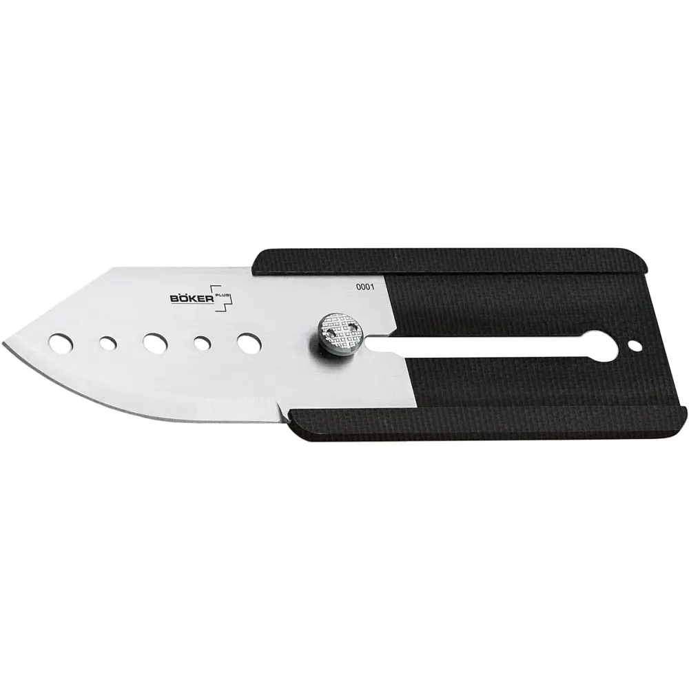 Складаний ніж для щоденного носіння Boker Plus Slyde-R розроблений дизайнером Джоном Кубасеком і відрізняється не тільки своїми компактними розмірами, але і дизайнерським рішенням. Принцип відкривання у Slyde-R такий же, як і у канцелярського ножа. Для того щоб вийняти клинок, необхідно натиснути кнопку і висунути його з рукояті. Та ж кнопка використовується і для блокування ножа в складеному вигляді. Сатинований клинок довжиною всього 55 мм виготовлений з американської нержавіючої сталі 440С, а рукоять виконана зі зносостійкого склотекстоліту G10. Є отвір для кулькового ланцюжка, який входить в комплект поставки ножа.