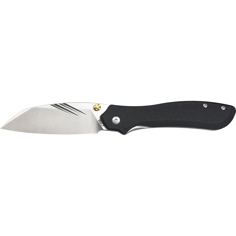 CJRB Fugly - це один з незвичних дизайнів бренду. Модель натхненна австралійським сленгом та надихнула CJRB на творчі пошуки унікальних елементів дизайну. Увага до деталей є ключовим моментом, наприклад, золоті шпеники навмисно не збігаються з кліпсою, бонками або осьовим гвинтом. Таке рішення додає ножу "непередбачуваності", але при цьому він залишається зручним інструментом для повсякденного носіння з неймовірно функціональною формою клинка. CJRB Fugly отримав клинок з фірмової сталі AR-RPM9 (Artisan-Rare Powdered Material 9 Element Steel), яка має однорідну структуру та дозволяє зберігати гостроту різальної крайки протягом тривалого періоду, проста в правці і відмінно витримує навантаження. Відкриття клинка відбувається за рахунок шпеника або фронт фліпера, а у відкритому положенні фіксується замком Liner Lock. Ергономічні накладки руків'я виготовлені зі склотекстоліту G10. На торці розміщена кліпса глибокої посадки для зручного носіння ножа на кишені.
