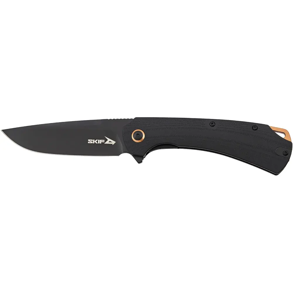 Модель складаних ножів Frontier від Skif Knives вдало поєднала в собі функціональність і елегантність. Модель Frontier - це перша колаборація бренду Skif Knives з відомим ножовим дизайнером, а саме Олексієм Нестеренко. Модель представлена у двох колірних варіаціях: в чорному та Stonewash. Frontier отримав клинок профілю Drop Point із інструментальної сталі D2. Дана марка сталі довго зберігає гостроту різальної кромки і легко піддається заточці. В поєднанні з профілем клинка, ніж демонструє гарні колюче-різальні якості. В залежності від обраної моделі, фінішна обробка клинка може відрізнятись: Stonewash для маскування подряпин, які можуть виникнути під час експлуатації або захисне чорне покриття. Також, для більшої впевненості та комфорту під час використання, на обуху розміщений ряд насічок для упору великим пальцем. Ніж приводиться у робоче положення за допомогою фліпера, а плавний та м’який вихід клинка гарантує система керамічних шарикопідшипників. Фіксується у робочому положенні надійним замком Liner-Lock. Модель Frontier має два варіанти накладок на руків’ї: приємна на дотик зелена мікарта або цупкий склотекстоліт G10. Прикрашене руків’я кільцем бронзового кольору навколо осьового гвинта. В такому ж кольорі виконаний бекспейсер, який підвищує надійність конструкції. Для комфортного носіння в кишені, передбачена двостороння кліпса глибокої посадки, а також отвір для темляка на бекспейсері. Увага! Для уникнення появи плям на поверхні клинка, рекомендуємо насухо протирати клинок після контакту з вологим середовищем. Тим не менш, поява плям є хімічною реакцією сталі та не є браком чи гарантійним випадком.