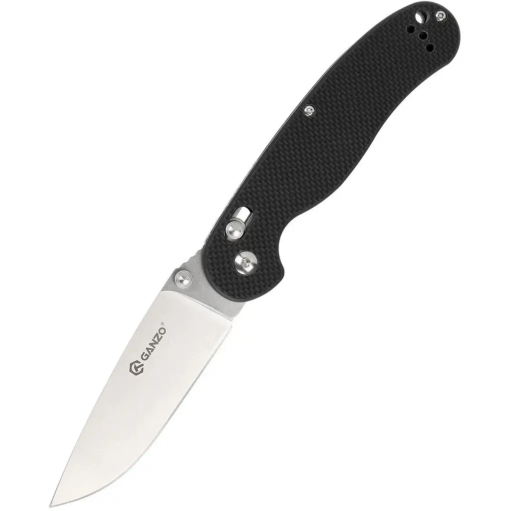 Лезо ножа зроблено з нержавіючої сталі, що також великий плюс для ножа, який використовується на природі. У даній моделі використовується марка сталі D2. яка крім високої опірності корозії відрізняється ще й досить великою твердістю (60 одиниць Роквелла). Заточений ніж гладко, що дає можливість різати ним практично будь-які продукти і матеріали. Ganzo 727m довго залишається гострим і легко заточується навіть за допомогою кишенькової точила в польових умовах. Розміри клинка складають 8.9 см при загальних габаритах ножа 21 см. зате в складеному положенні інструмент має розміри всього 12 см. Товщина леза в районі обуха становить 3.5 мм.