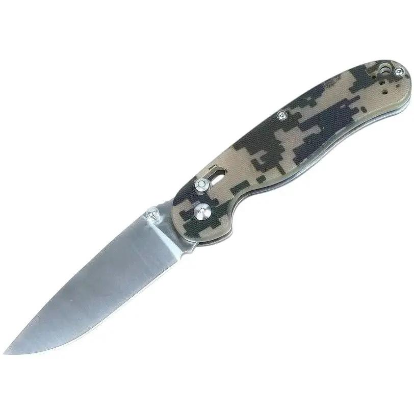 Рукоятка кожного ножа Ganzo 727m облицьована накладками зі склопластику G10. Це сучасний композитний матеріал з високими показниками зносостійкості і здатністю витримувати вплив багатьох хімічно активних речовин. Для вибору доступні чотири колірних варіанти рукоятки: чорний, помаранчевий, болотно-зелений і камуфляжний, незалежно від кольору, поверхня будь рукоятки текстурована, щоб його можна було міцніше тримати в руках. Крім того, виробники завбачливо розмістили на рукоятці кліпсу для кріплення ножа на ремінь і отвір для протягування темляка.