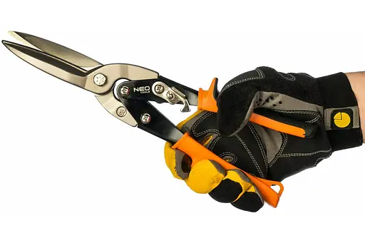 Ножиці по металу Neo Tools подовжені призначені для різання сталі завтовшки до 0.6 мм, загартованої сталі завтовшки до 0.3 мм, алюміній завтовшки 1 мм, міді - до 1.1 мм, а також пластмас - до 5 мм. Корпус виготовлений із високоякісної хром-молібденової сталі. Леза з індукційним загартуванням, що забезпечує довгий термін служби. Конструкція не дає змогу матеріалу вислизати з рук під час роботи. Завдяки антиковзким накладкам на ручці, інструмент добре лягає в долоню й не вислизає. Гострі крайки губок легко та плавно ріжуть листовий метал. Гарантією високої якості та надійності інструмента є сертифікат TÜV Rheinland.