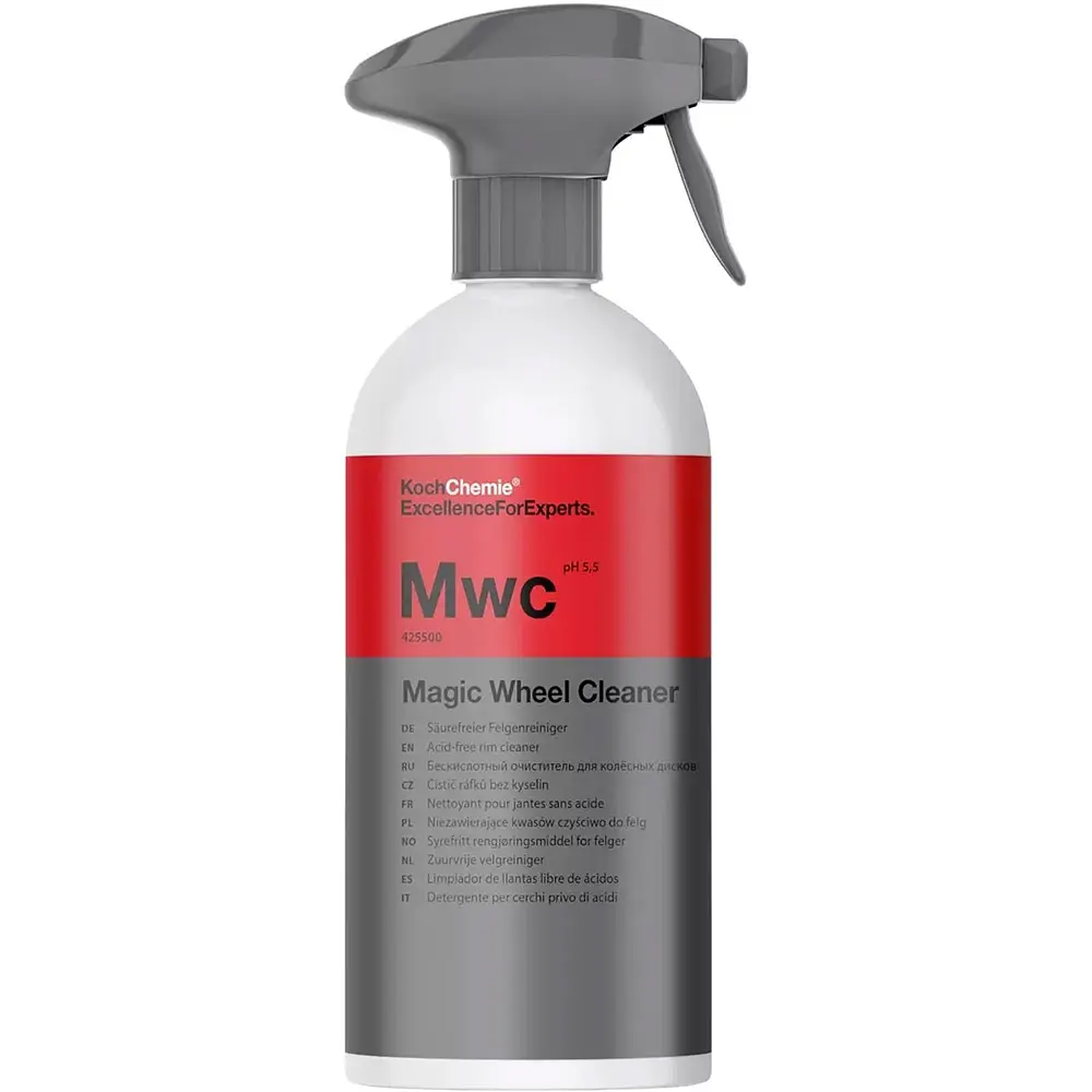 Очищувач Koch Chemie Magic Wheel Cleaner для всіх видів дисків - це потужний, безкислотний очищувач в'язкої консистенції, що має інноваційні характеристики, які дозволяють м'яко і ретельно очистити колісні диски та їх основи. Його реактивний компонент розчиняє частки іржі з характерним червоним кольором. Спеціальні диспергатори м'яко видаляють стійке забруднення з поверхні. Його густа консистенція гарантує, що нанесений очищувач Magic Wheel Cleaner відмінно триматиметься на оброблюваній поверхні. І навіть при більш тривалому часі впливу склад не висихає, виробляючи при цьому інкапсуляцію бруду.