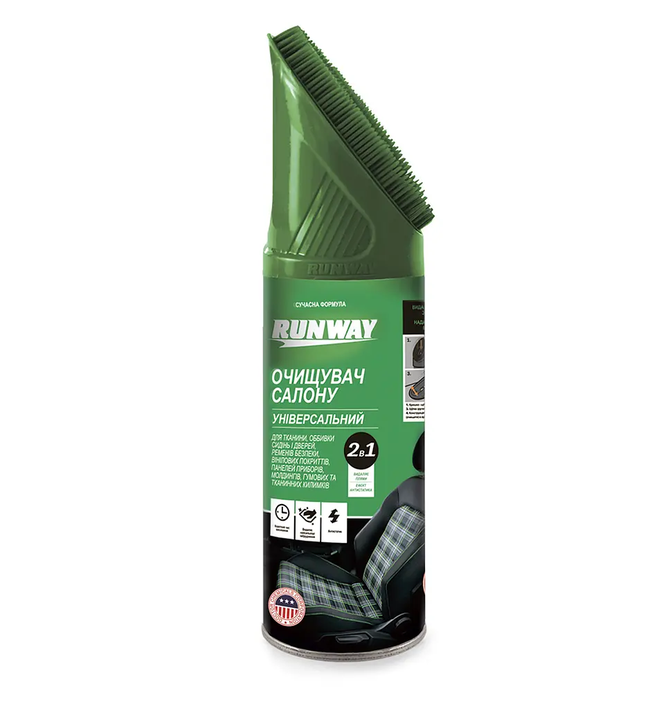 Очищувач салону універсальний Runway 2 в 1 є багатофункціональним засобом, призначеним для використання на різних поверхнях в автомобільному салоні. Це включає тканину, оббивку сидінь і дверей, ремені безпеки, вінілові покриття, панелі приладів, молдинги, а також гумові та тканинні килимки для підлоги.