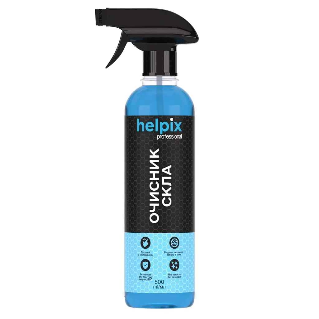 Очисник скла Helpix Professional – засіб для миття скла, дзеркал та інших скляних поверхонь, призначений для видалення типових забруднень автомобільного скла, включаючи складні (пташиний послід, смола з деревини, залишки комах). Застосовується як зовні, так і всередині салону. Не підходить для видалення стійких мінеральних відкладень та бітуму. Повністю сумісний із лакофарбовим покриттям авто, гумовими ущільнювачами та гумою на склоочисниках лобового скла.