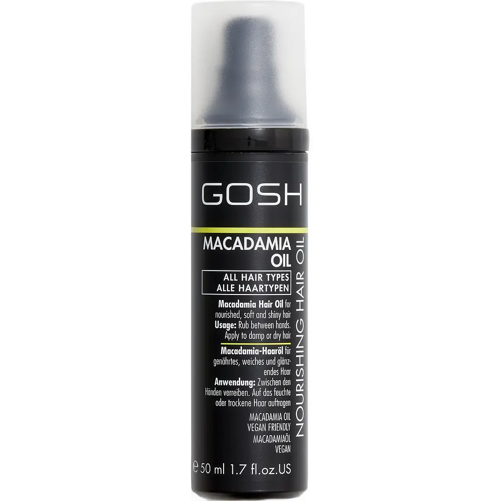 Олія для волосся Gosh Nourishing Hair Macadamia Oil спеціально розроблена для догляду для всіх типів волосся, особливо вона допоможе вирішити проблеми із сухими пошкодженими локонами. Завдяки спеціальному складу на основі олії макадамії засіб має легку текстуру, живить пасма по всій довжині та згладжує посічені кінчики, полегшує укладання.