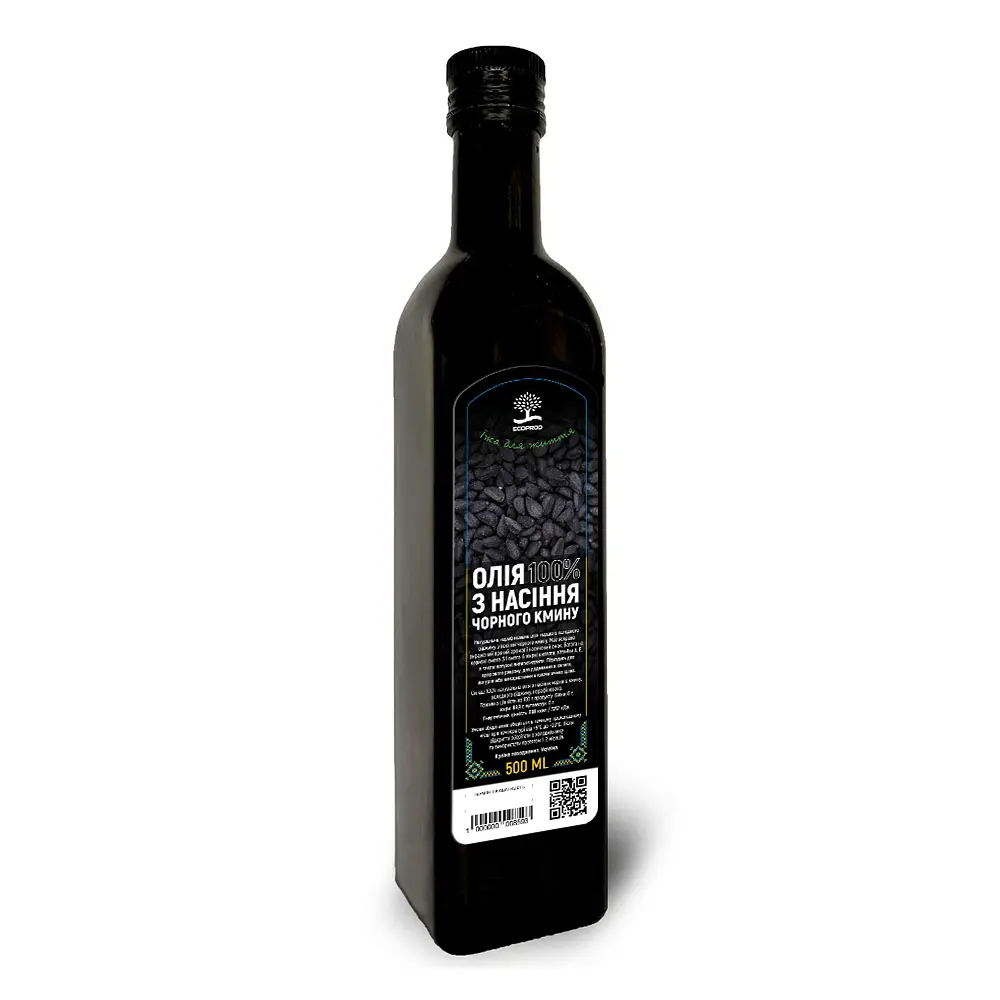 Олія чорного кмину — це унікальний природний антибіотик та найпотужніший імуностимулятор. Виготовлена методом першого холодного пресування з відбірного насіння, вона зберігає високу концентрацію тимохінону — активної речовини, що має протизапальну, антибактеріальну та протипухлинну дію. Олія має характерний терпкий, пряний смак з легкою гірчинкою та сильний аромат.