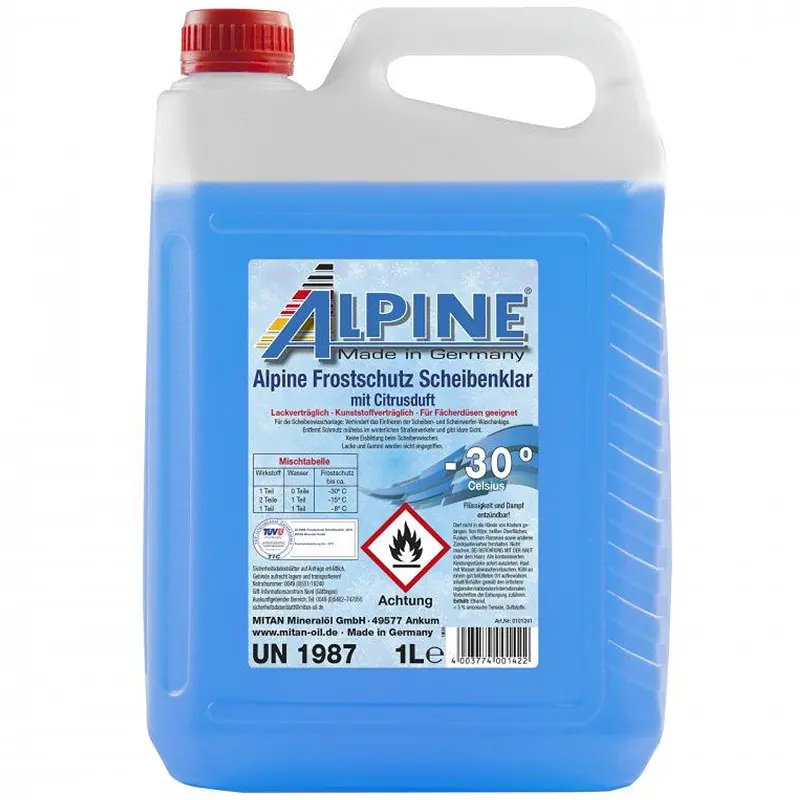 Омивач скла Alpine Frostschutz Scheibenklar не допускає замерзання системи склоомивача в холодну пору року та забезпечує якісний огляд у дорожньому русі завдяки інтенсивній очисній дії.