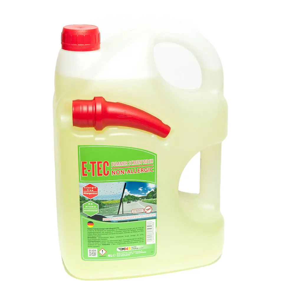 Готова рідина для омивача скла E-TEС – літня рідина для омивача скла, що належить до 4 класу безпеки (рідина малої небезпеки).