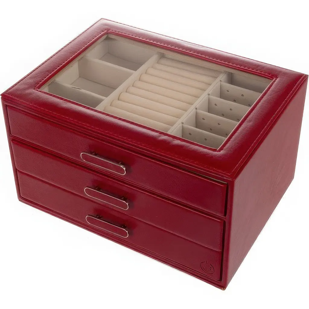 Верхній відсік з прозорою кришкою дозволяє швидко знаходити потрібні аксесуари без відкривання. Усередині розташовані м'які перегородки для каблучок, сережок, підвісок і браслетів.