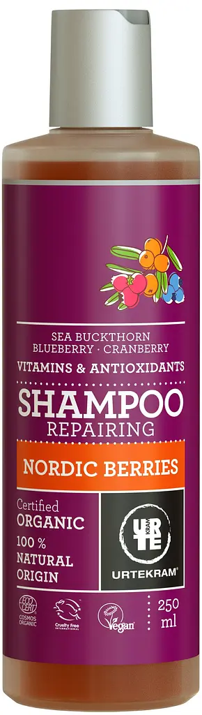 Органічний шампунь Urtekram Скандинавські ягоди ефективно очищає шкіру голови та волосся.