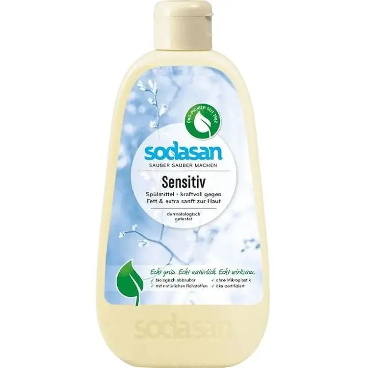 Органічний засіб-концентрат для миття посуду Sodasan Sensitive спеціально розроблений для людей, схильних до алергічних реакцій.